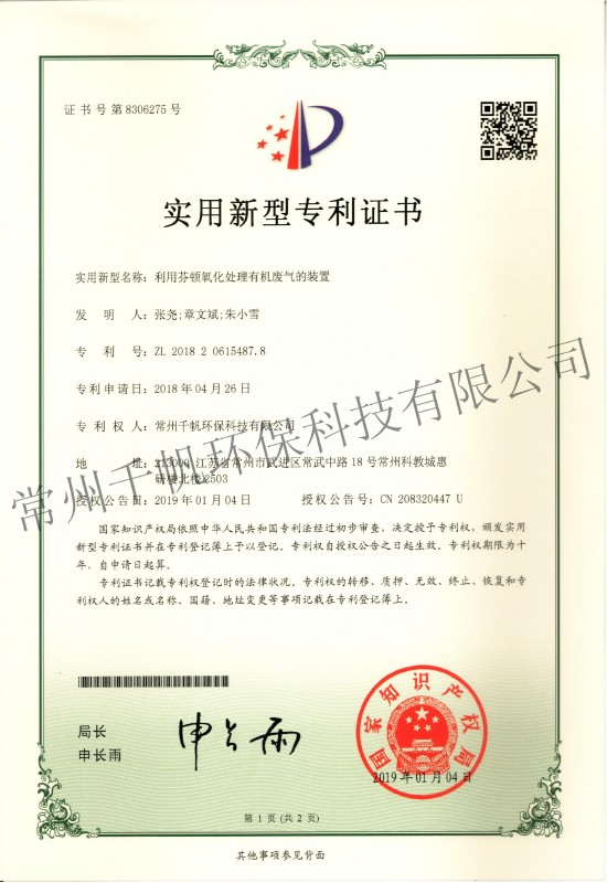 實(shí)用新型專利證書 利用芬頓氧化處理有機(jī)廢氣的裝置