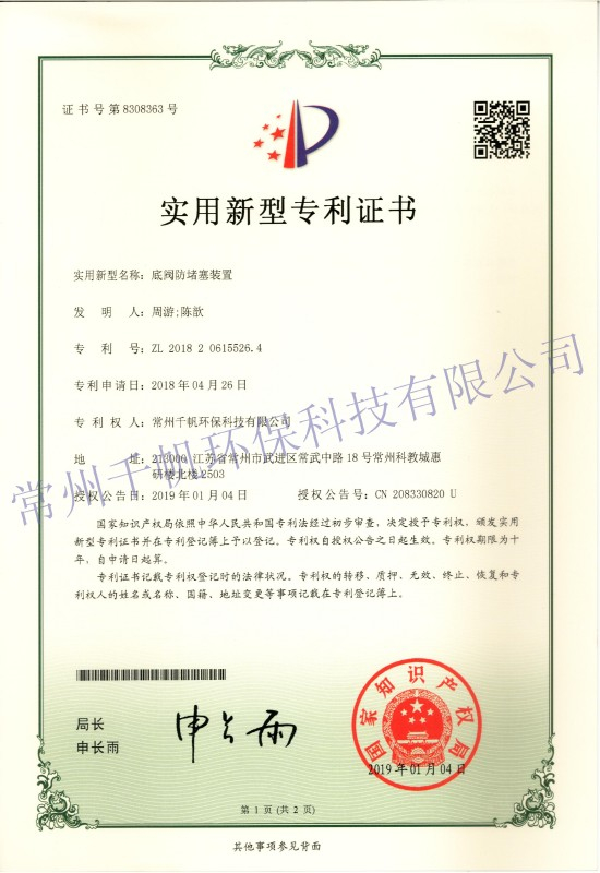 實(shí)用新型專利證書 底閥防堵塞裝置
