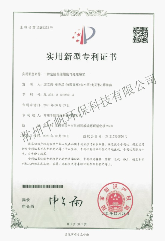 實(shí)用新型專利證書  一種危險(xiǎn)品儲(chǔ)罐廢氣處理裝置