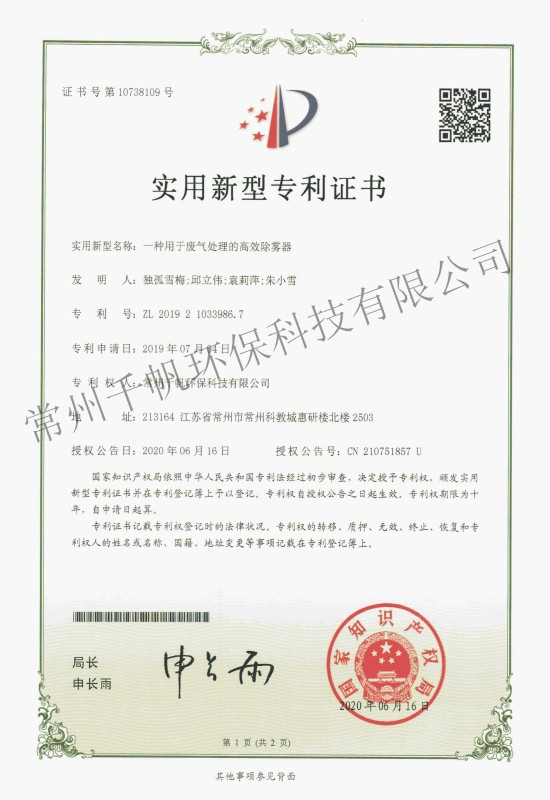 實(shí)用新型專利證書  一種用于廢氣處理的高效除霧器