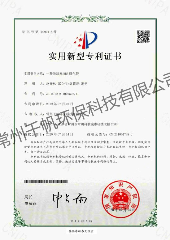 實(shí)用新型專利證書 一種防堵塞MBR曝氣管